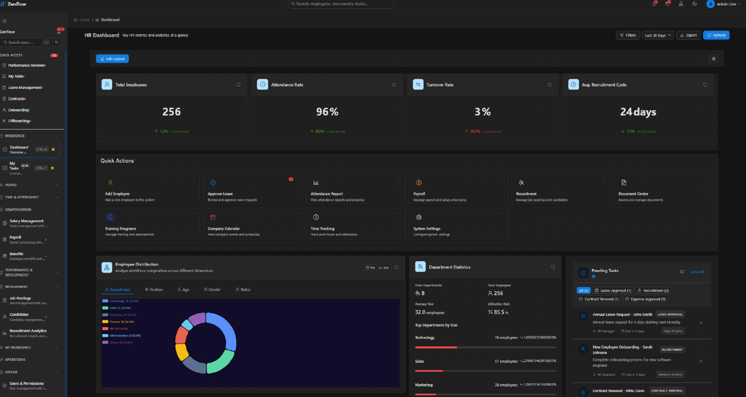 Enterprise Office Automation Platform Zenflow OA is an integrated digital workspace built for medium and large enterprises.It unifies HR, attendance, payroll, performance, training into one platform